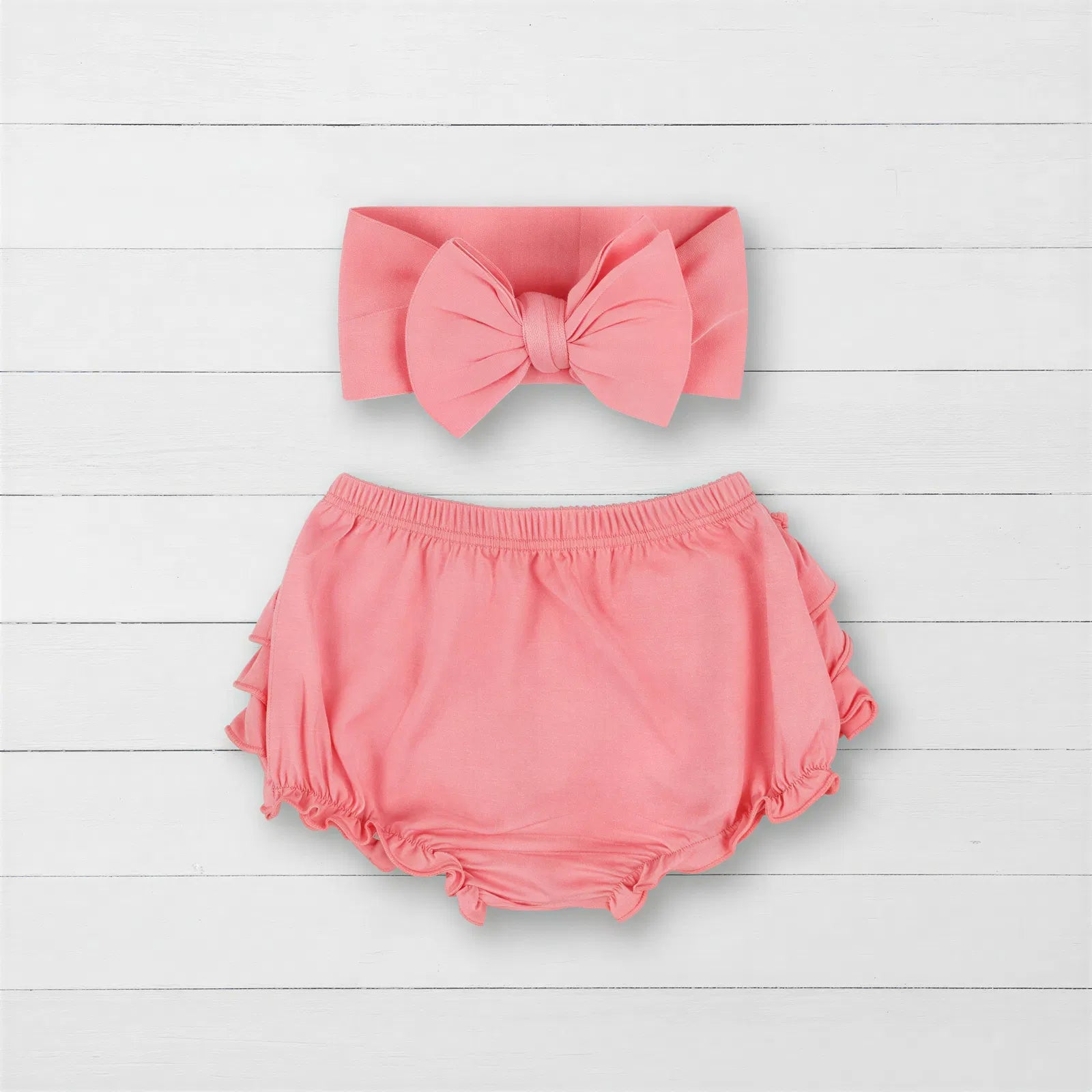 These super cute ruffle bloomers set are the perfect addition to your little ones summer wardrobe. Keep them cool and comfy and super cute! Set includes ruffled bloomer and headband. Ruffles are on the back side of the bloomer.
