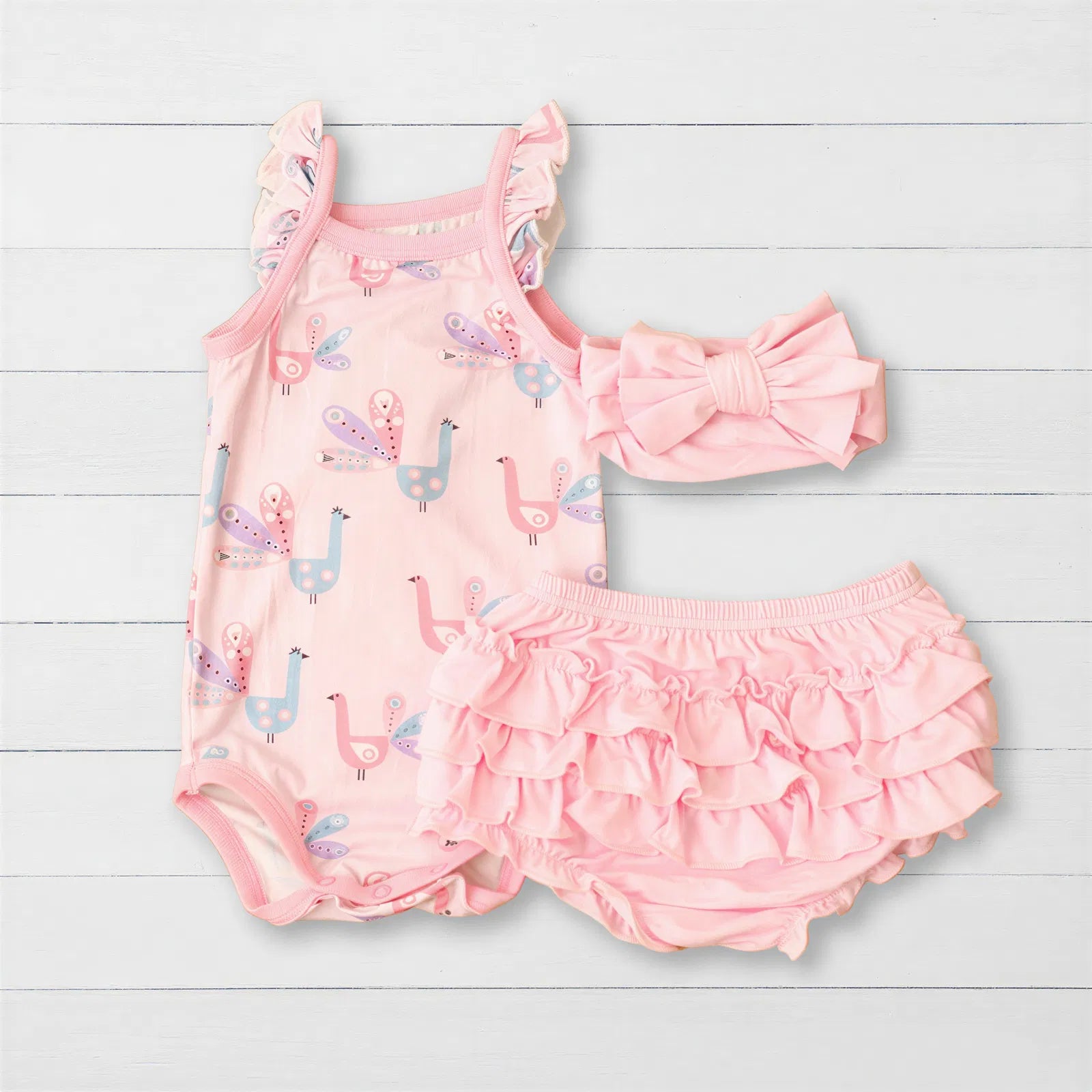 These super cute ruffle bloomers set are the perfect addition to your little ones summer wardrobe. Keep them cool and comfy and super cute! Set includes ruffle bloomer, onesie and headband. Ruffles are on the back of the bloomer.