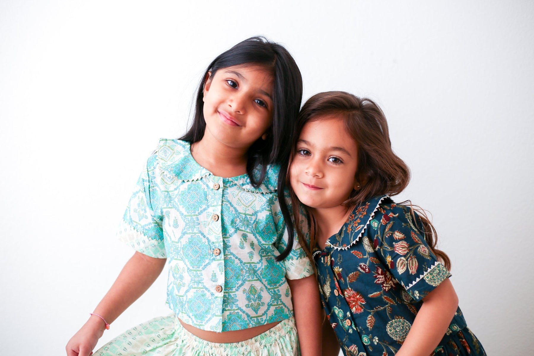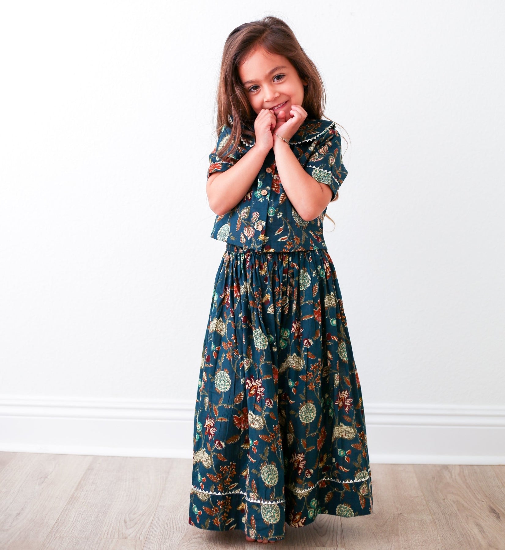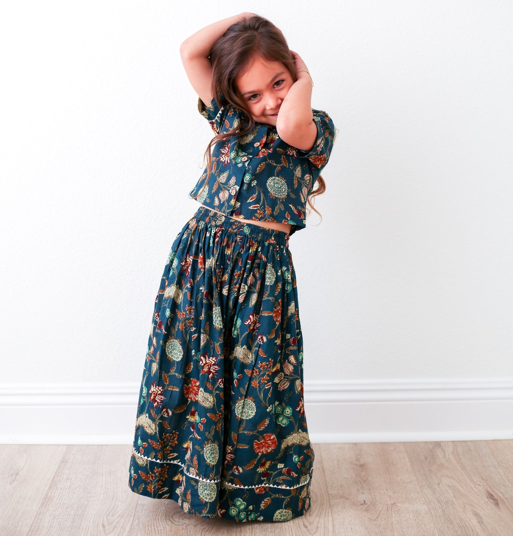 Add some ethnic flair to your little girl's wardrobe with the Meera Lehenga in navy. Featuring a unique pattern of ethnic flowers and a collar with wooden buttons, this lehenga is both stylish and comfortable with its elastic waist. Perfect for adding a touch of India to any special occasion!