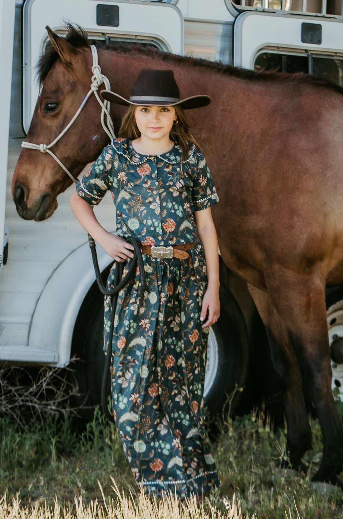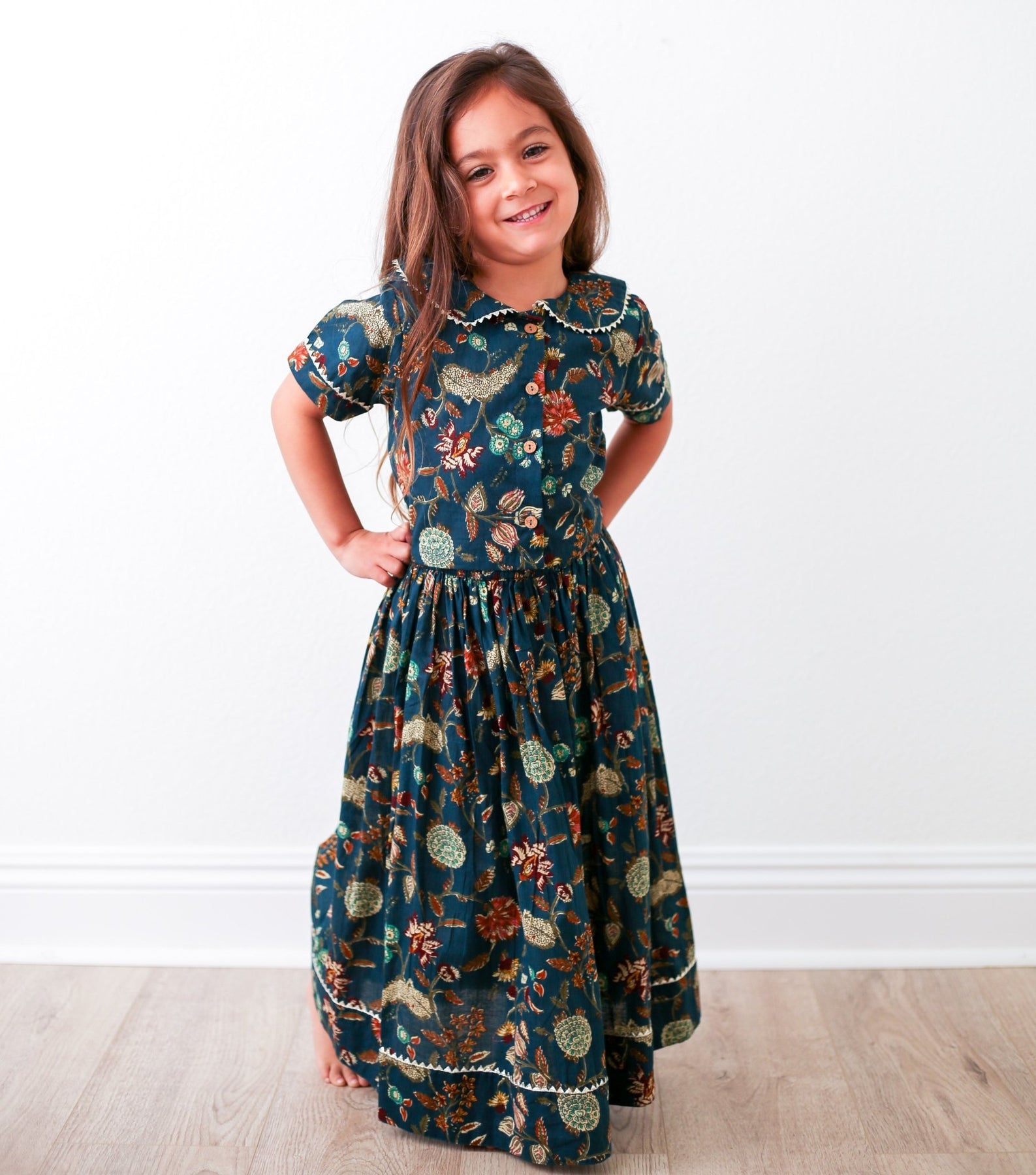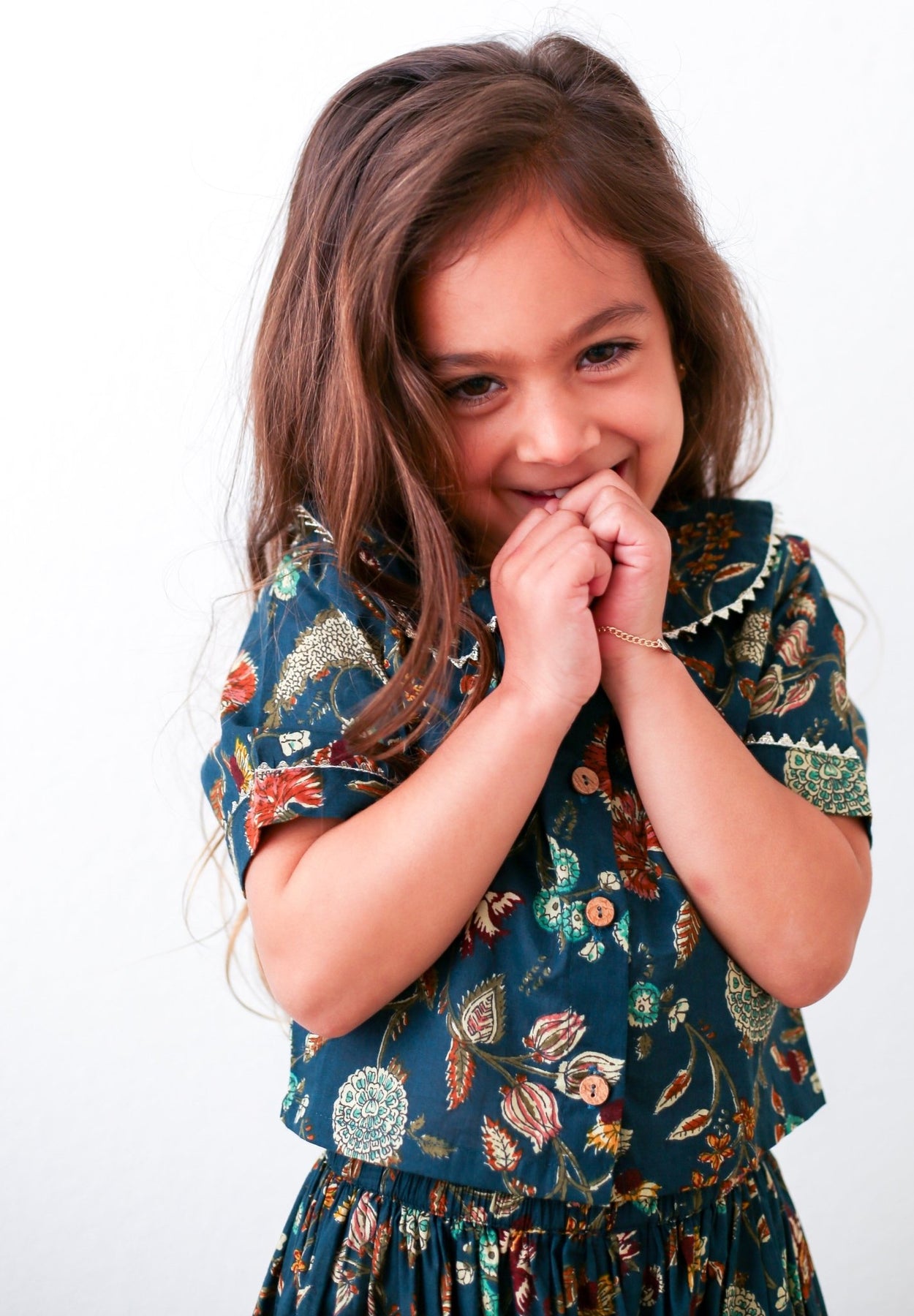 Add some ethnic flair to your little girl's wardrobe with the Meera Lehenga in navy. Featuring a unique pattern of ethnic flowers and a collar with wooden buttons, this lehenga is both stylish and comfortable with its elastic waist. Perfect for adding a touch of India to any special occasion!