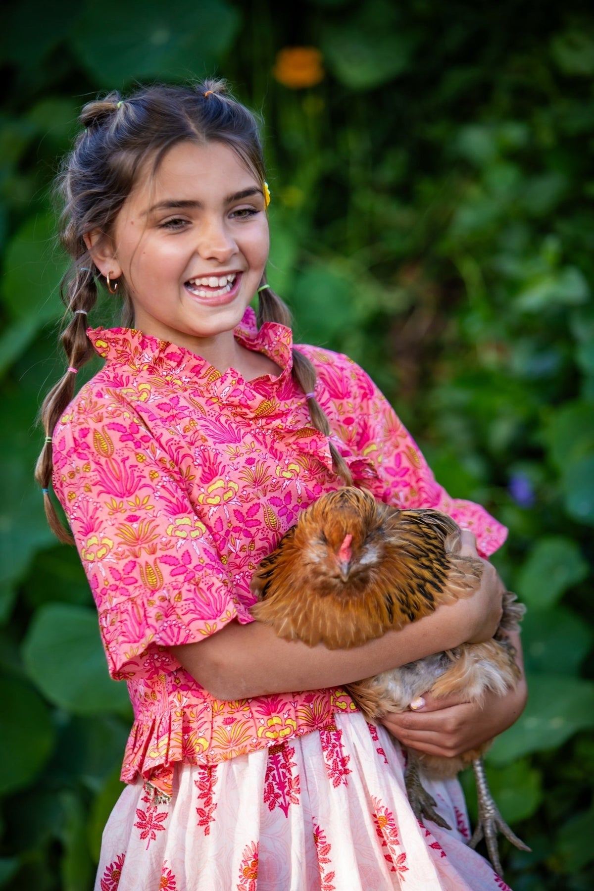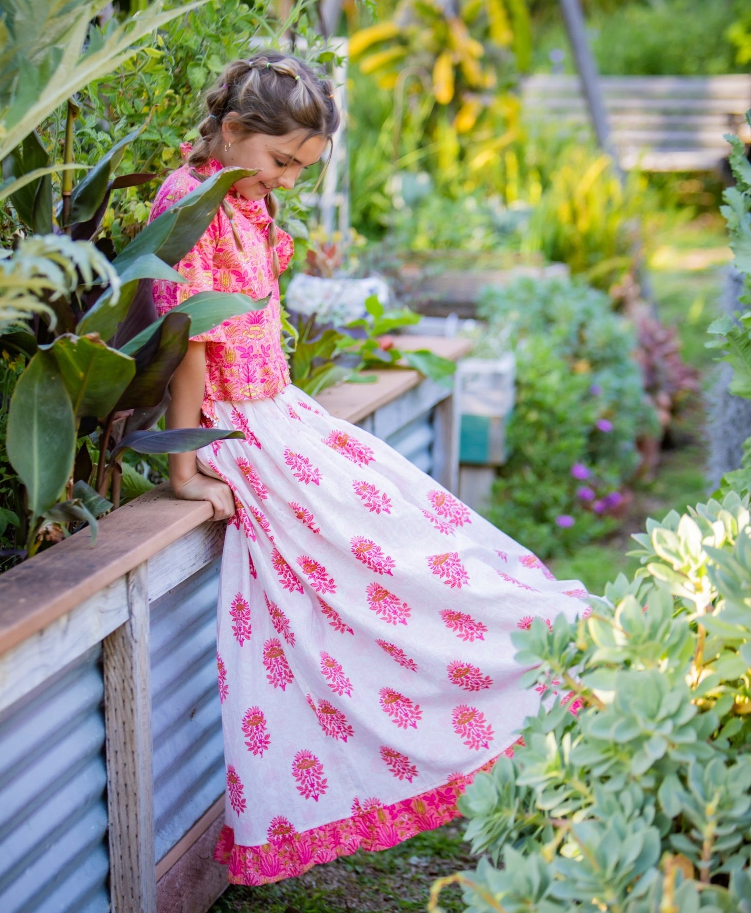 Add a touch of playful color and vibrancy to any occasion with our Janya Lehenga. With a beautiful, colorful design and bright pink accents, this little girls lehenga features a wraparound top with 3/4 sleeves and an elastic waist for comfort and style.