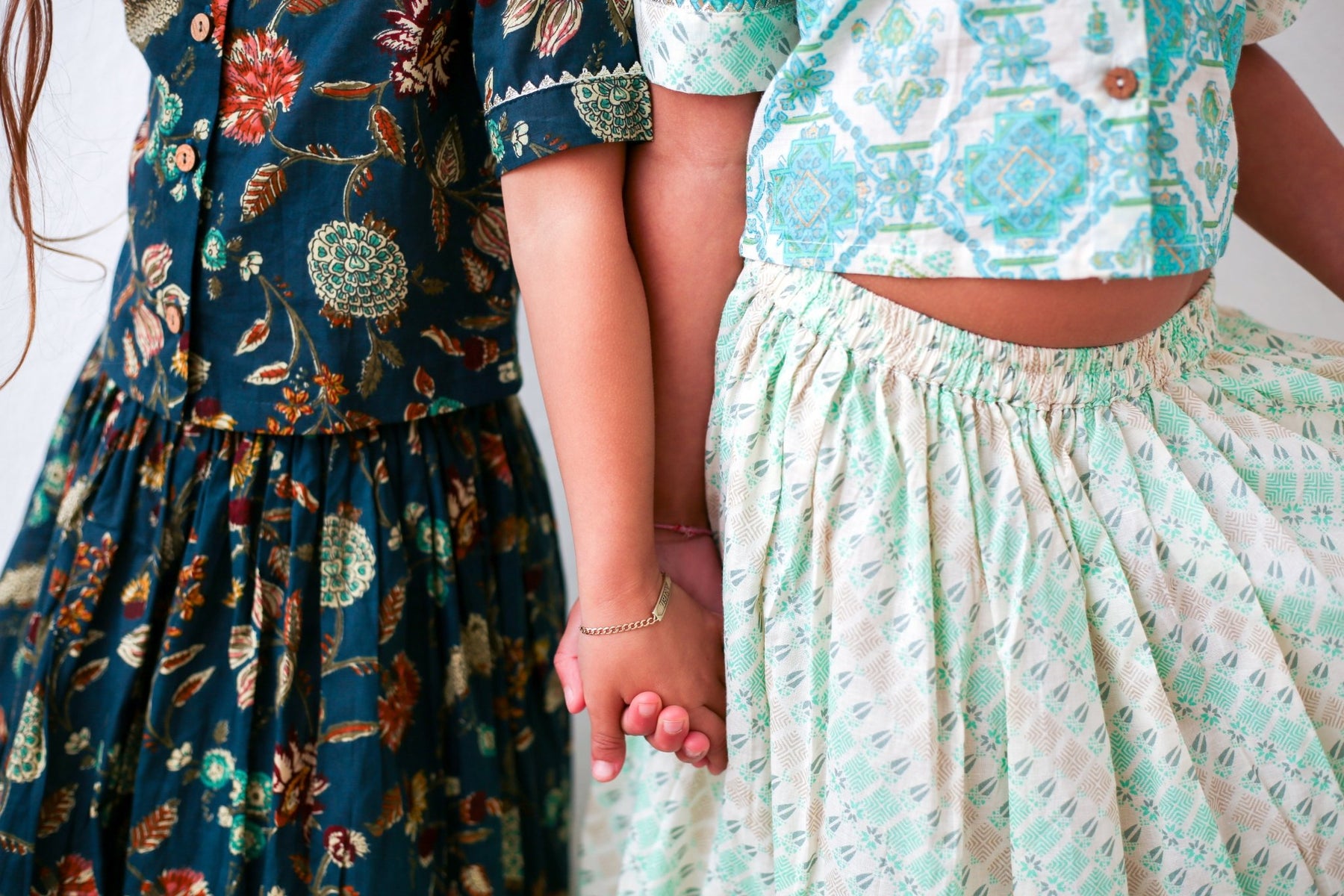 Add some ethnic flair to your little girl's wardrobe with the Meera Lehenga in teal. Featuring a unique pattern of ethnic flowers and a collar with wooden buttons, this lehenga is both stylish and comfortable with its elastic waist. Perfect for adding a touch of India to any special occasion!