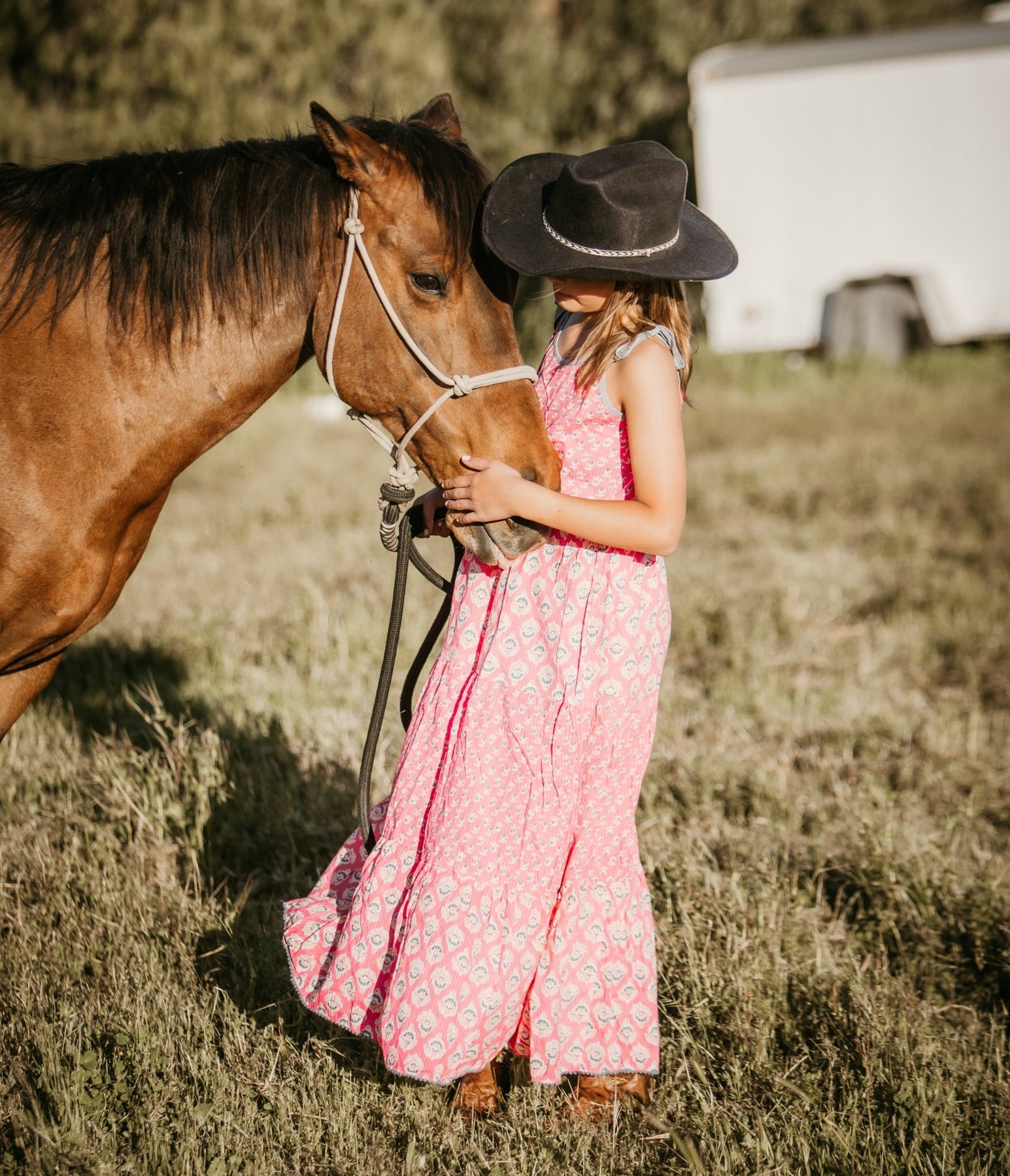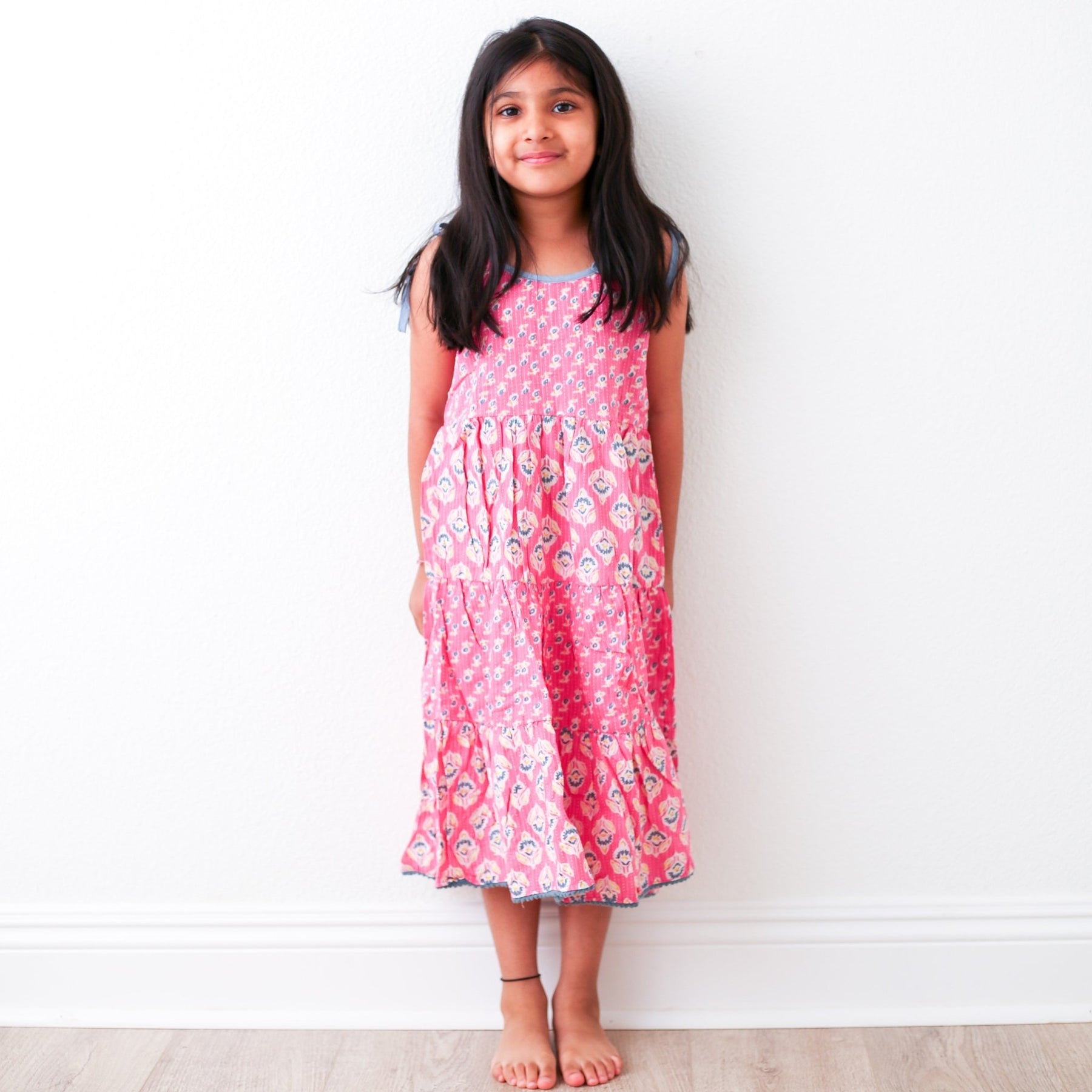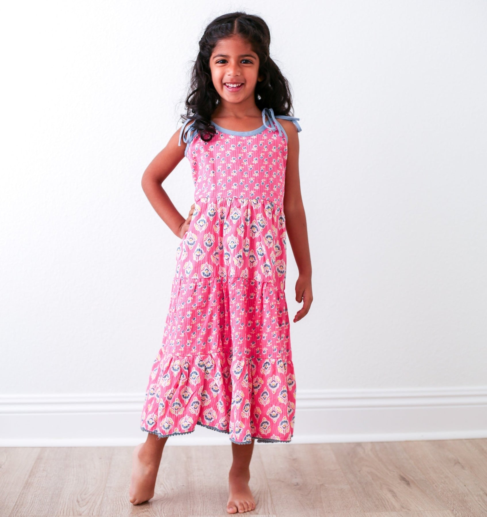 Get ready for summer in style with our Simran Maxi Dress! Perfect for the free-spirited soul, this pink maxi dress boasts a stylish Bohemian block print and adjustable tie straps for a fit that's just right. Get ready to conquer summer in style and comfort!