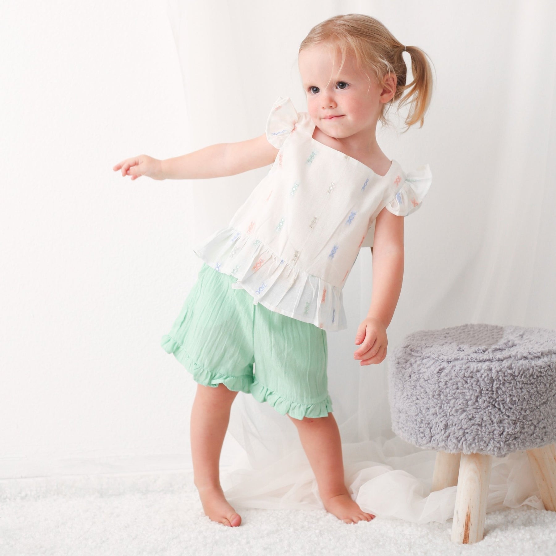 Add some pizzaz to your little girl's summer wardrobe with our Talya Mint Short and Top set! The sparkly top and soft, adjustable shorts are perfect for playtime or special occasions. Featuring flutter sleeves and a buttoned back, it's both stylish and comfortable. (Cuteness overload!)