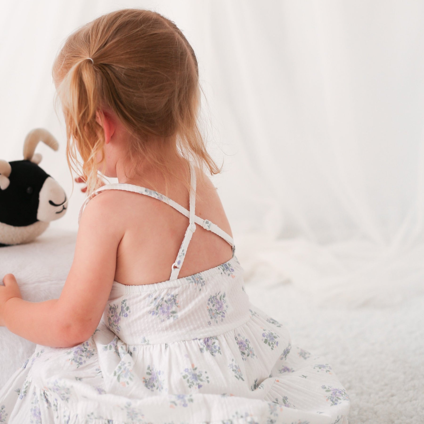 The Tiana Skye Dress is a must-have for little fashionistas! Featuring a charming print of pretty flowers on a crisp white background, this dress is perfect for twirling. The adjustable racer back ensures the perfect fit, so your little one can dance the day away in style.