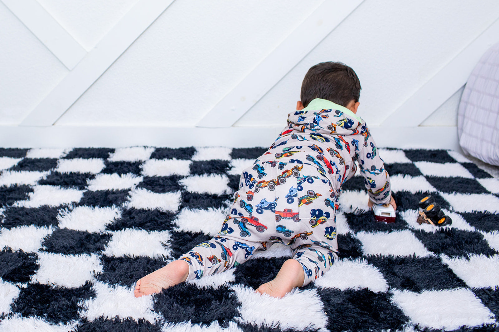Child wearing a colorful car-patterned onesie on a checkered rug.
