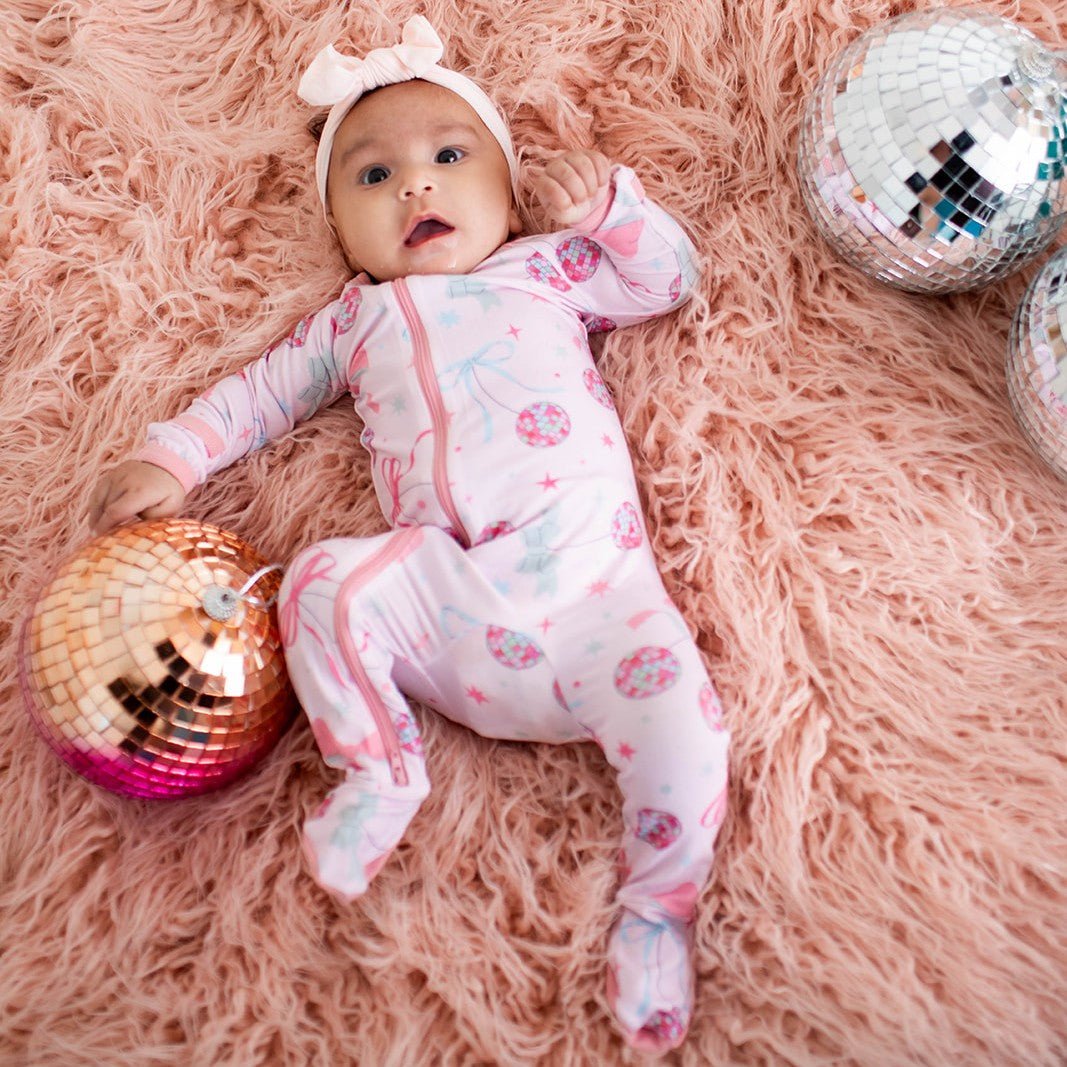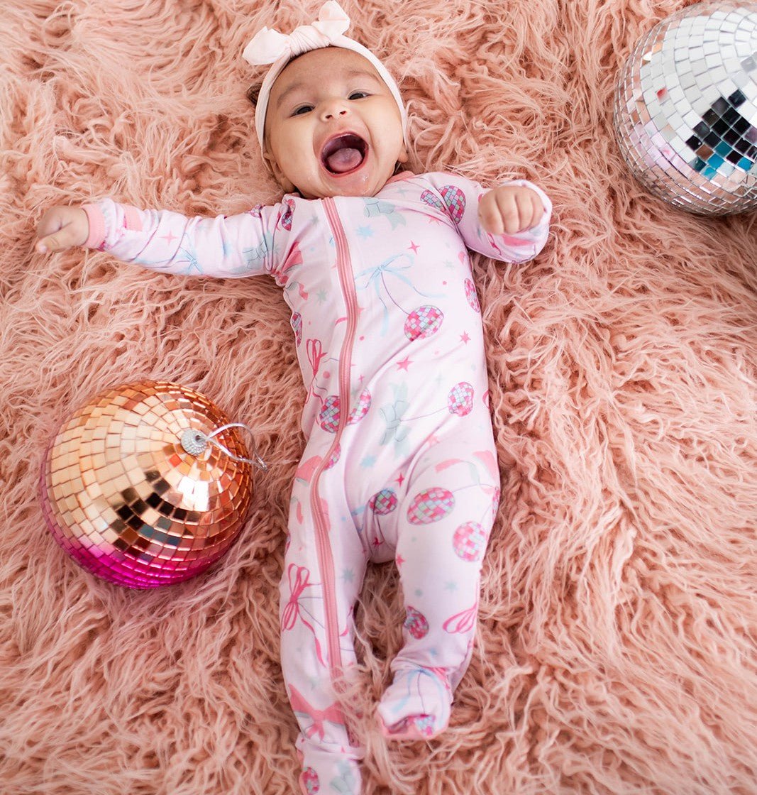 Keep your little snuggled up in our disco ball and bows print footie! Made with super soft bamboo, this footie features disco balls and sweet bows all over the print and a dual 2-way zipper for hassle-free diaper changes. Plus, keep little hands warm with fold over mittens on NB and 0/3m sizes, and foot grips on larger sizes. So soft and cozy, your baby will love it!