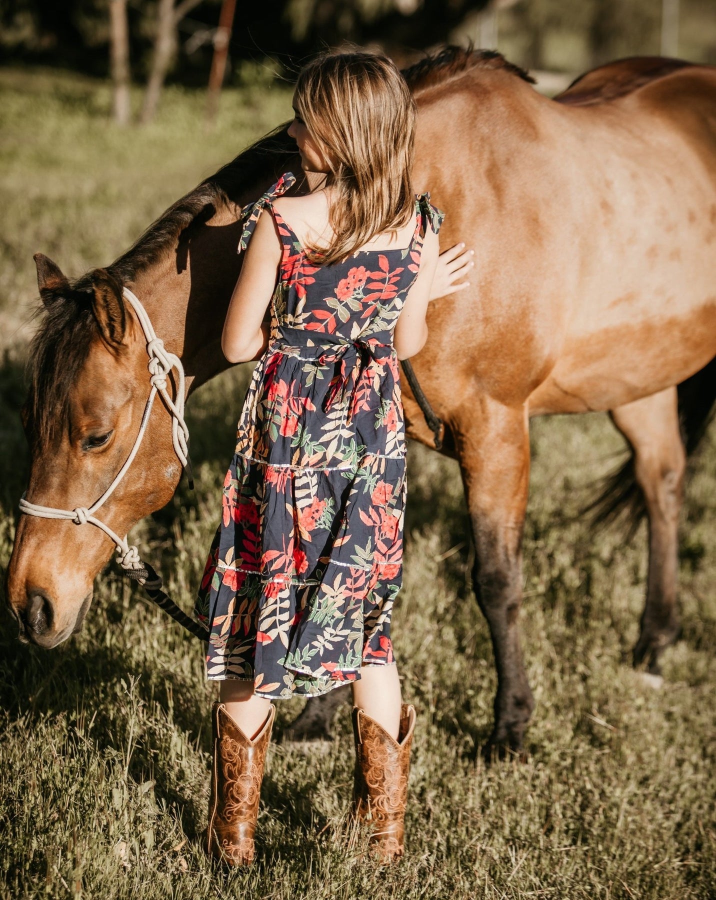 Get ready for summer in the cool and comfy Jazmin Dress! This dress is all about spring and summer time vibes, with the navy & spring leaves print and adjustable tie straps for the perfect fit. Every little fashionista needs this in her summer wardrobe!