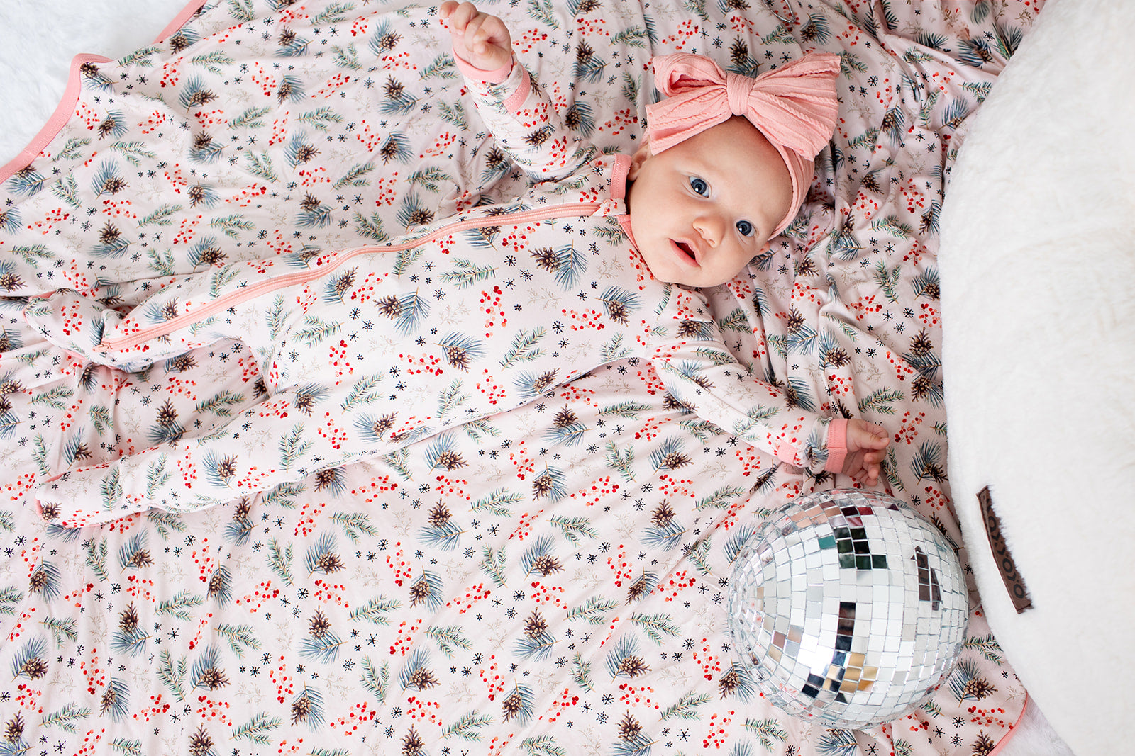 Baby wrapped in a floral blanket with a pink bow, sitting in front of a decorated Christmas tree.