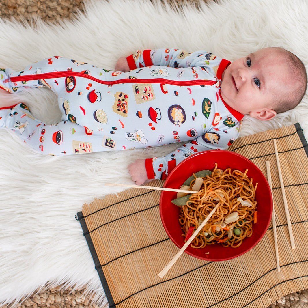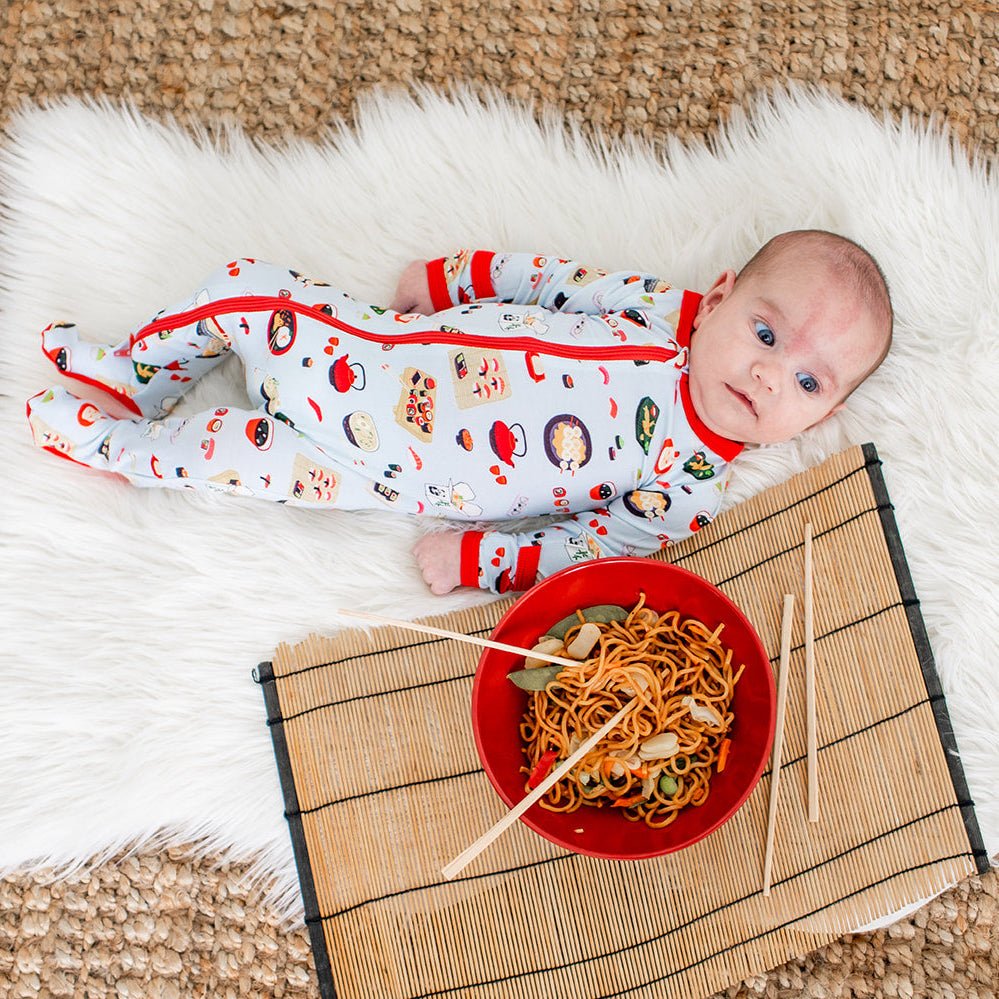 Keep your little one snuggled up in our sushi and ramen print footie! Made with super soft bamboo, this footie features a dual 2-way zipper for hassle-free diaper changes. Plus, keep little hands warm with fold over mittens on NB and 0/3m sizes, and foot grips on larger sizes. So soft and cozy, your baby will love it!