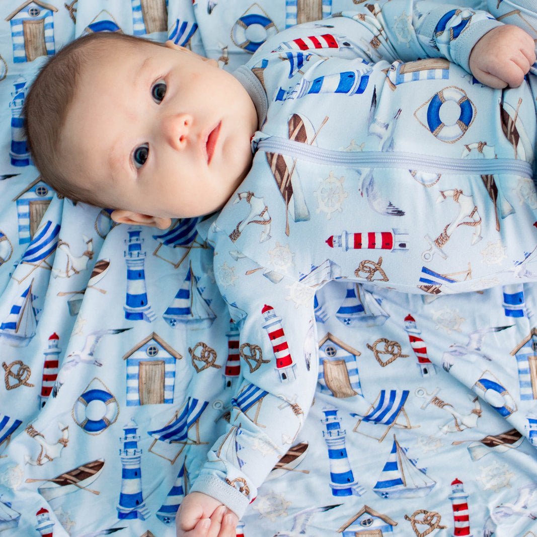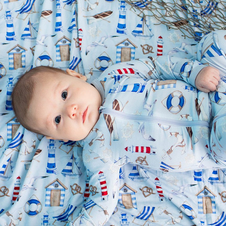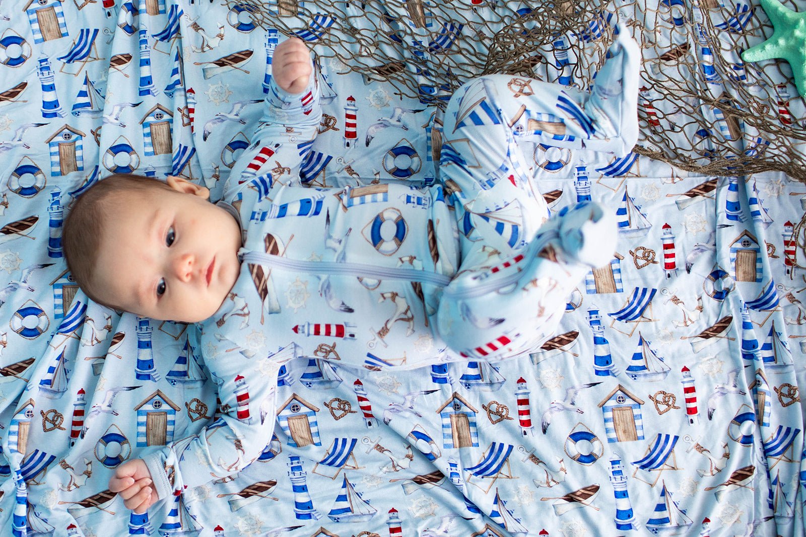 Keep your little one snuggled up in our Cape Cod footie! Made with super soft bamboo, this footie features a beachy them and a dual 2-way zipper for hassle-free diaper changes. Plus, keep little hands warm with fold over mittens on NB and 0/3m sizes, and foot grips on larger sizes. So soft and cozy, your baby will love it!