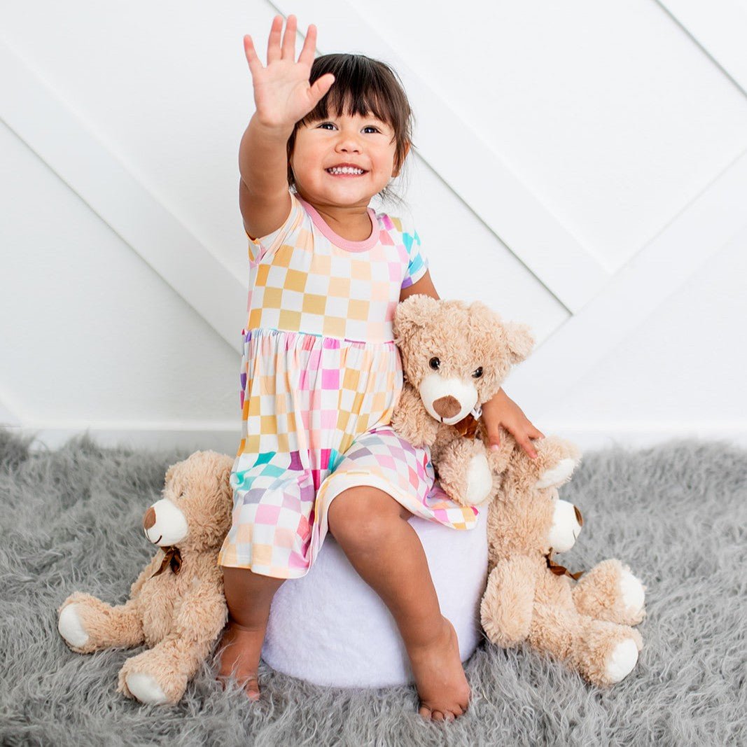 This dreamy dress is made to make any toddler twirl with joy! Soft bamboo fabric with short sleeves will keep them comfy and stylish while they explore, frolic, and flutter through their day!