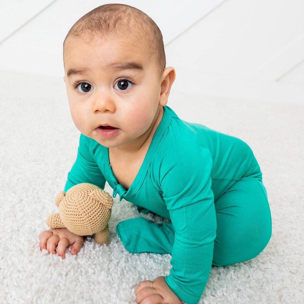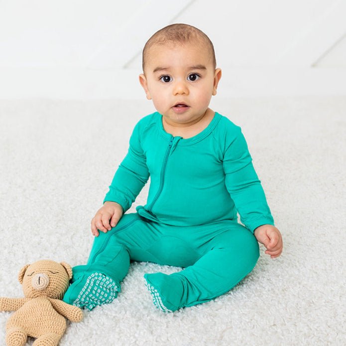 Keep your little one snuggled up in our Emerald green footie! Made with super soft bamboo, this footie features a beautiful green color and a dual 2-way zipper for hassle-free diaper changes. Plus, keep little hands warm with fold over mittens on NB and 0/3m sizes, and foot grips on larger sizes. So soft and cozy, your baby will love it!