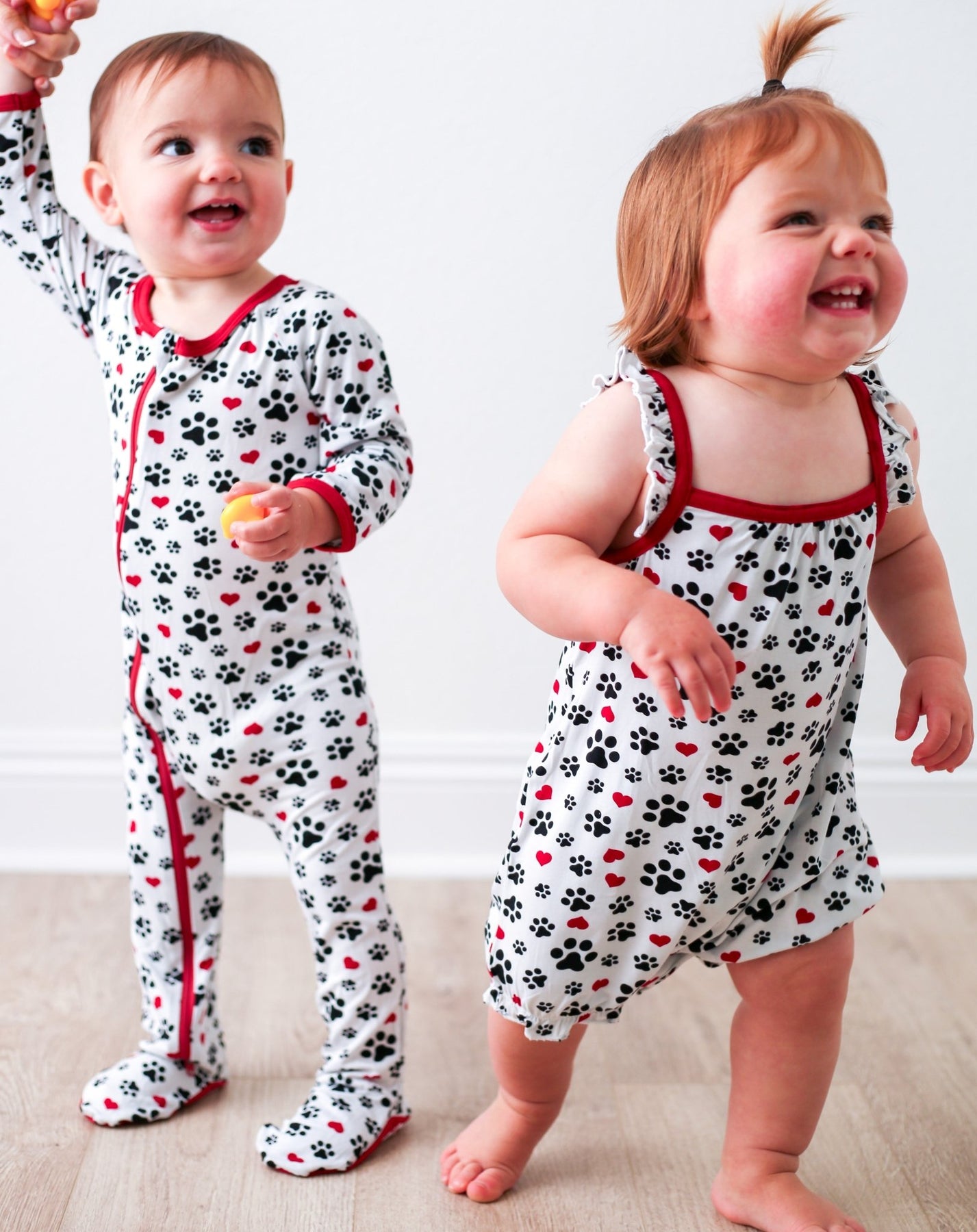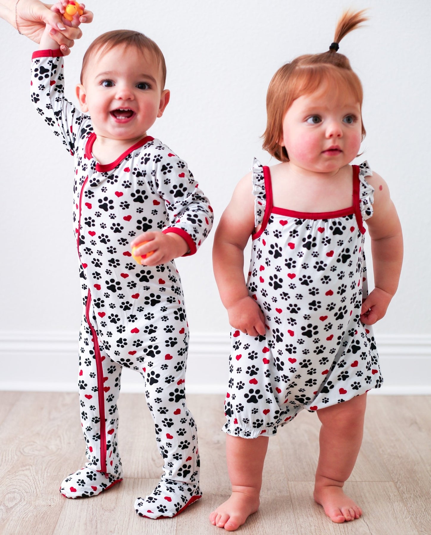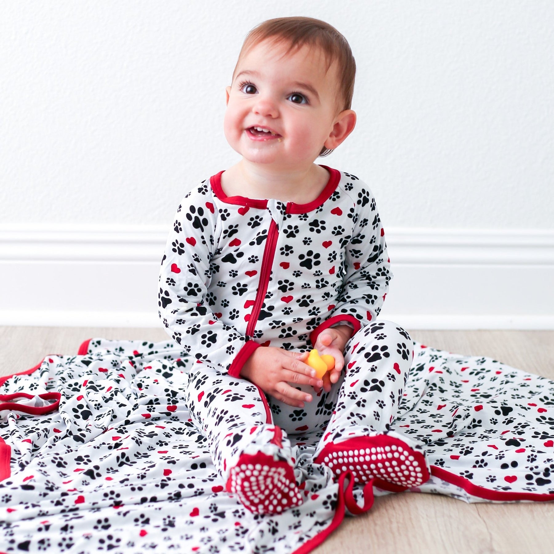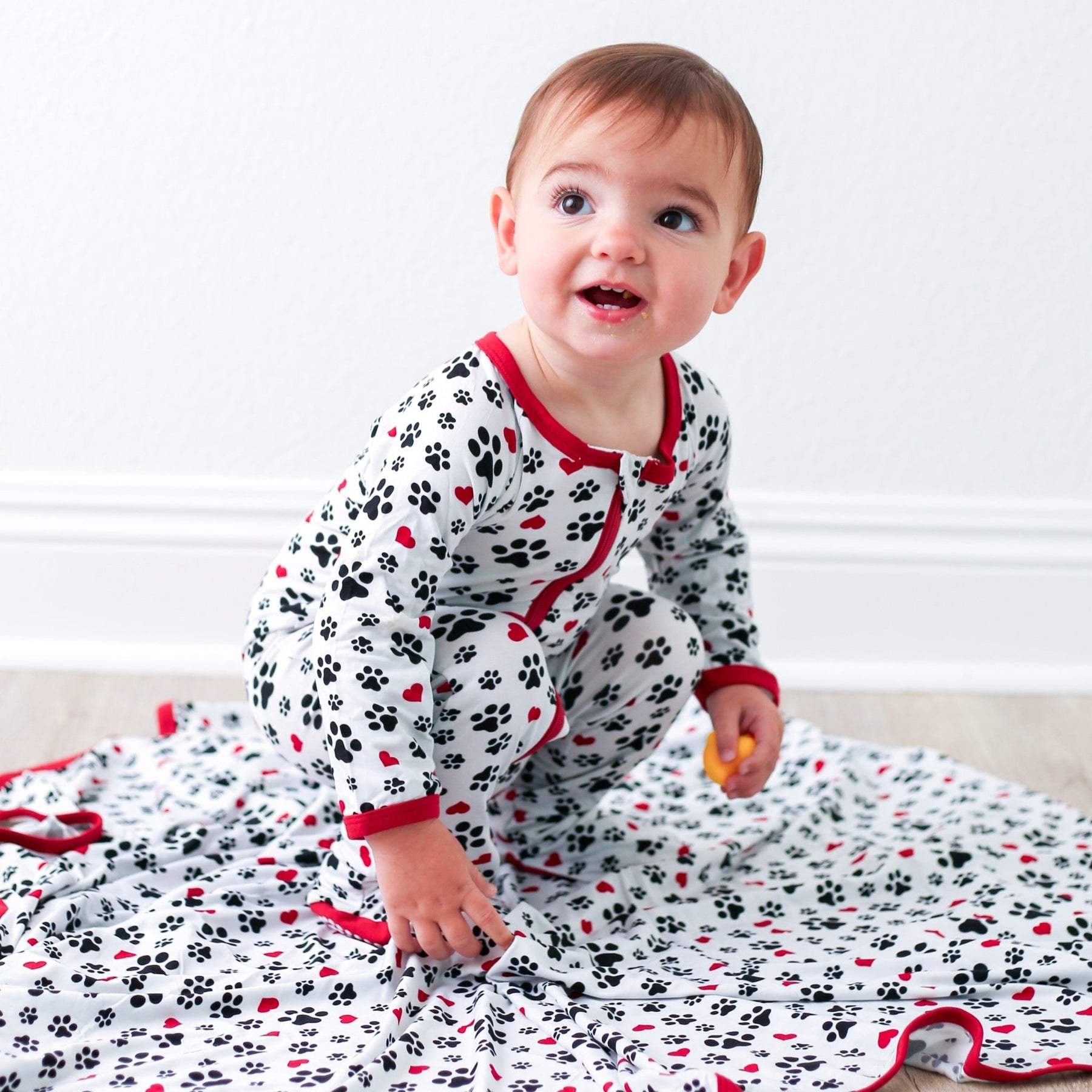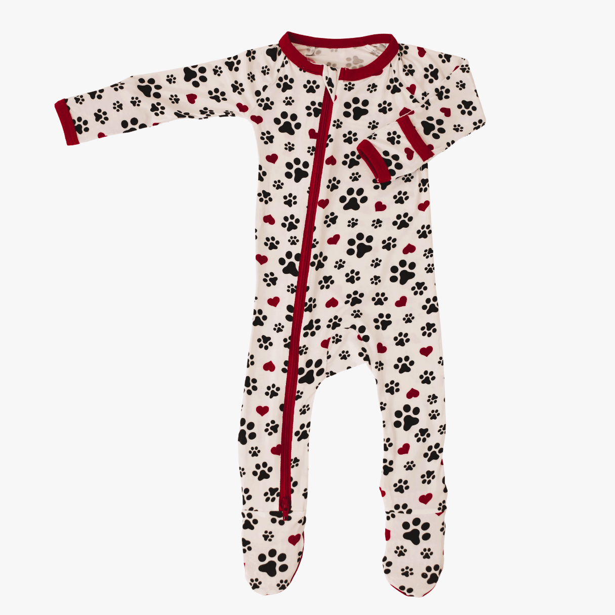 Get ready to cuddle with your little one in the ultra-soft bamboo LovePup Footie! This footie features a print of adorable puppy paws and hearts, perfect for any dog lover. Plus, with fold-over hand mittens for newborn and 0-3m sizes, and grippy feet for sizes over 9m, your baby will stay comfy and cute all night long.