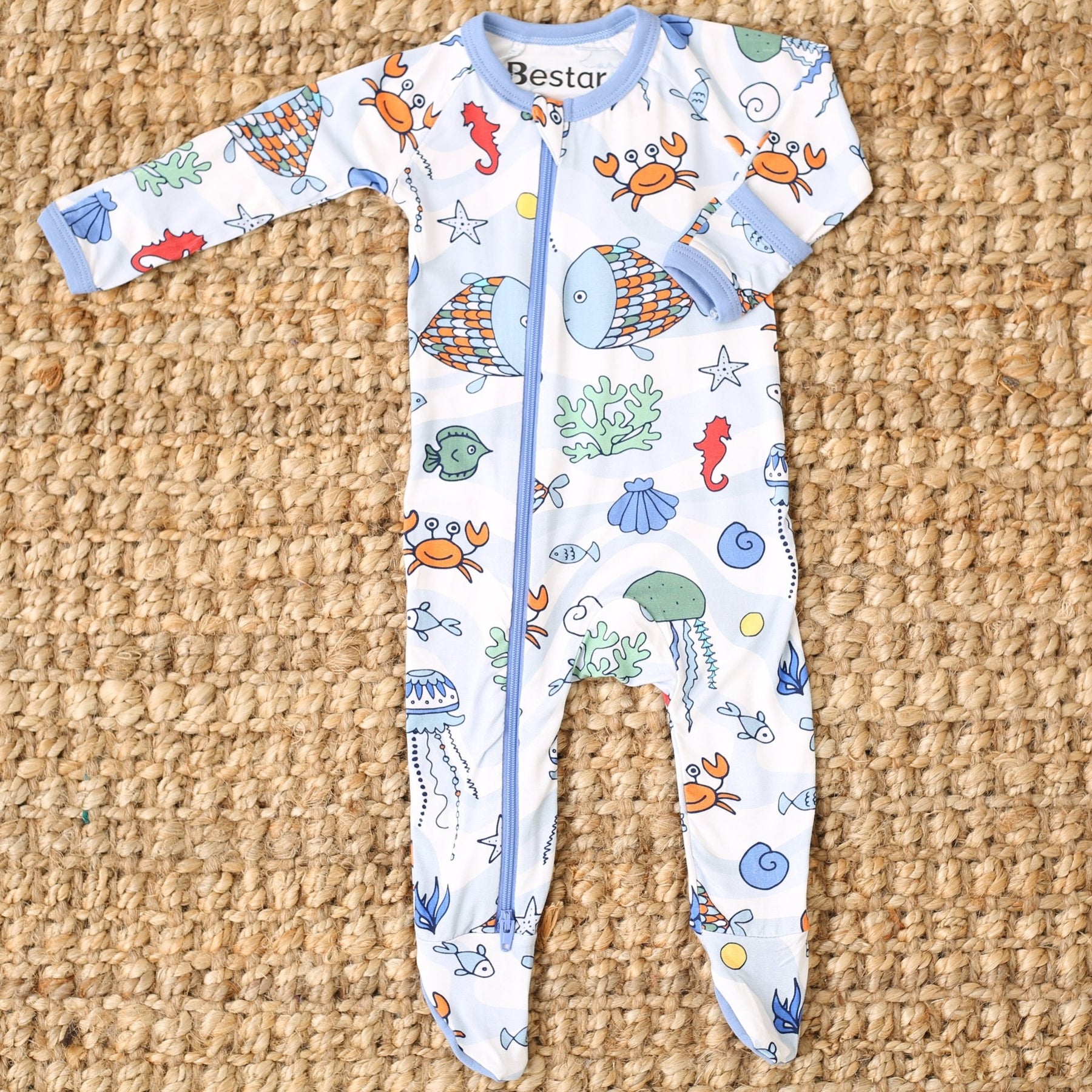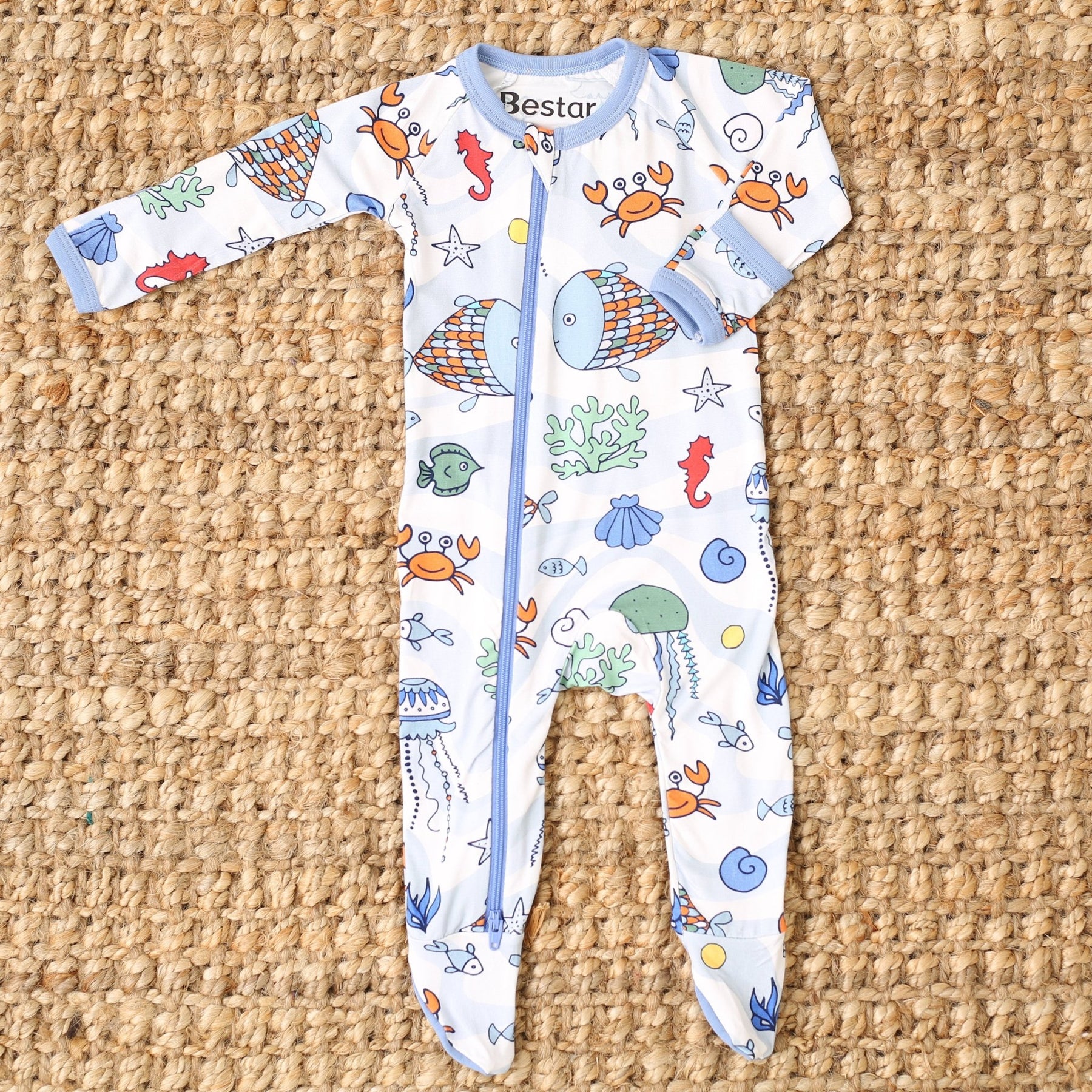 Keep your little one snuggled up in our Sea Life Swirls footie! Made with super soft bamboo, this footie features sea life creatures and a dual 2-way zipper for hassle-free diaper changes. Plus, keep little hands warm with fold over mittens on NB and 0/3m sizes, and foot grips on larger sizes. So soft and cozy, your baby will love it!