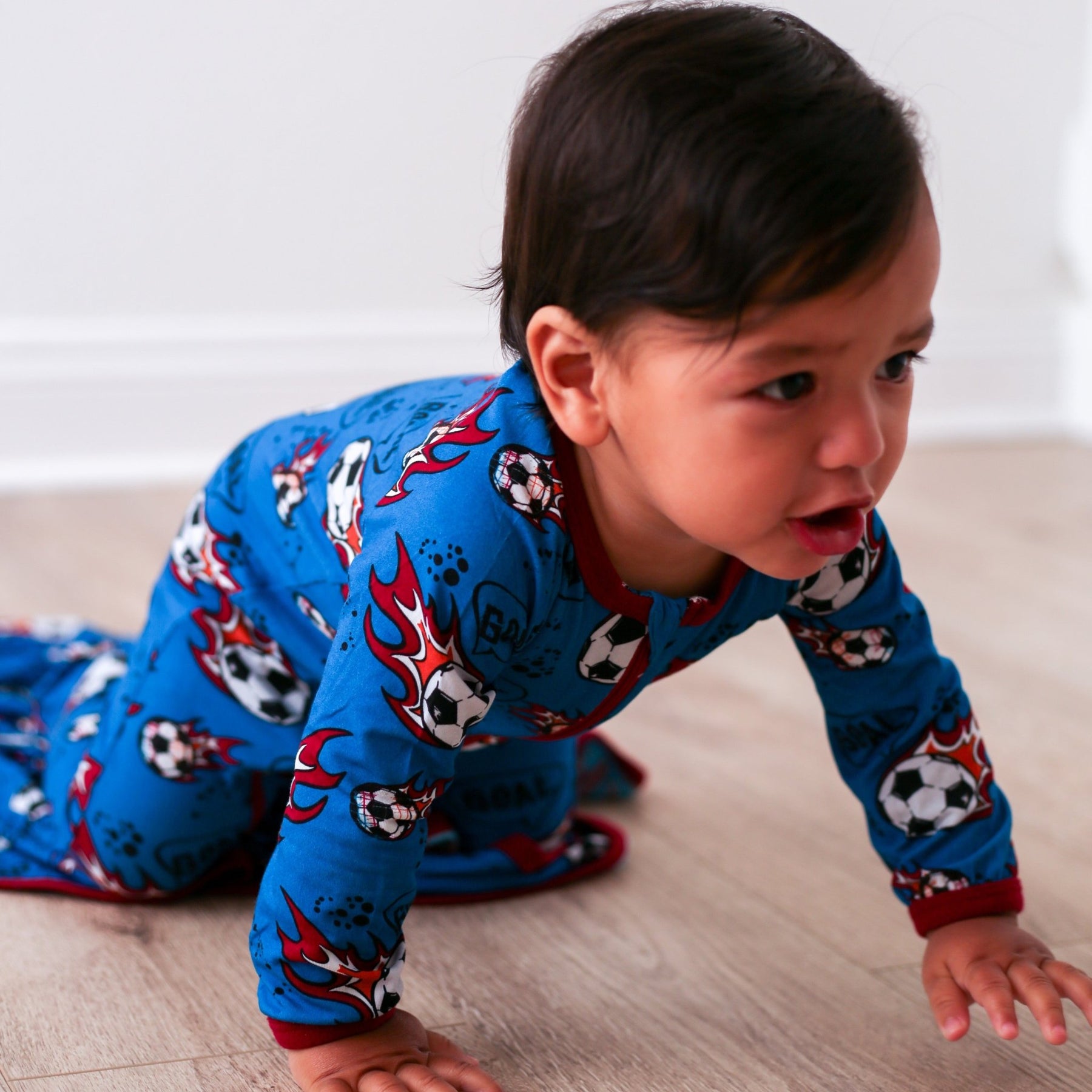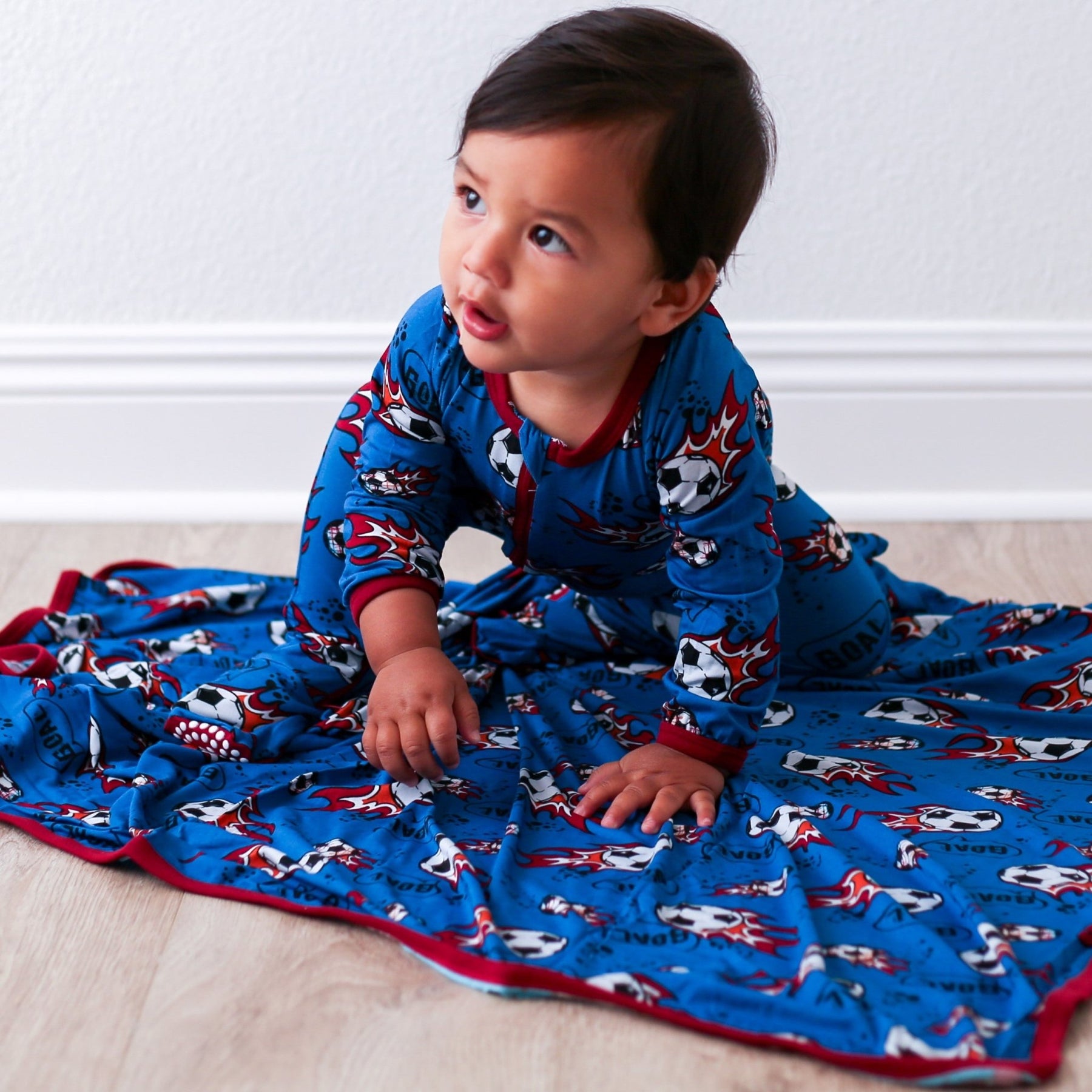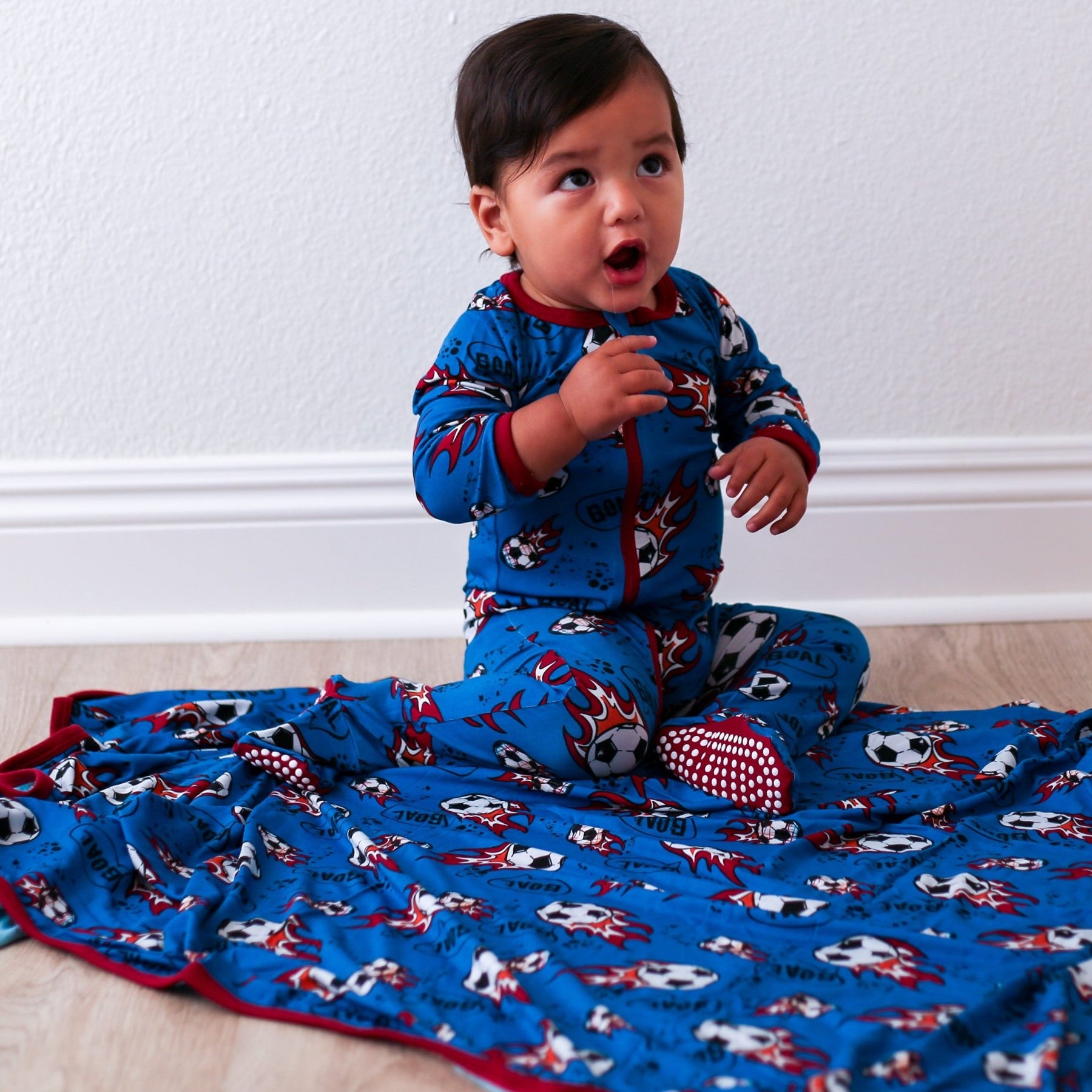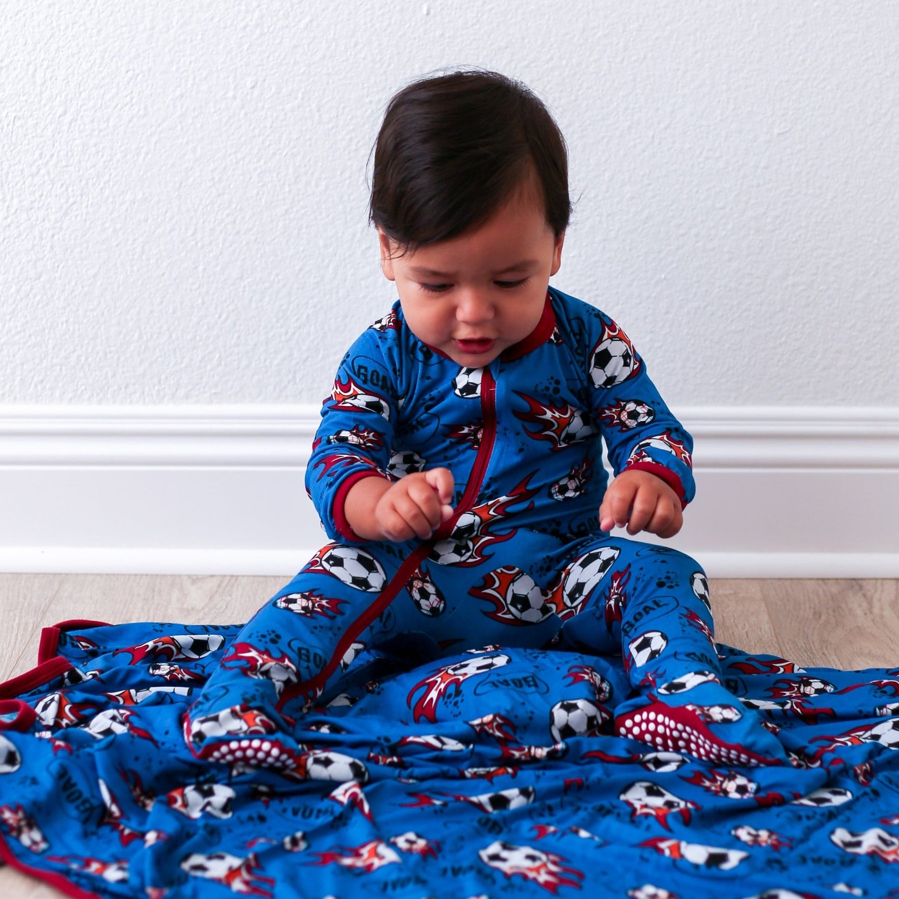 Score a goal for comfort with our Soccer Footie! Made of super soft bamboo, this footie will keep your little one cool and comfy all night long. Featuring a playful print of soccer balls, this is the perfect choice for any soccer lover. Available in sizes with foot grips and fold-over hand mittens for added comfort & convenience.