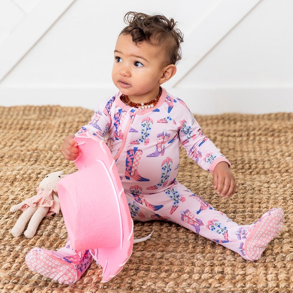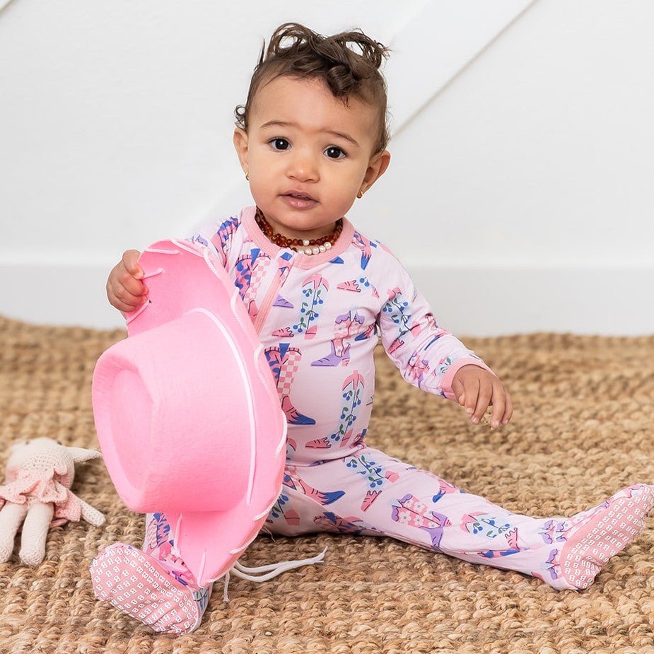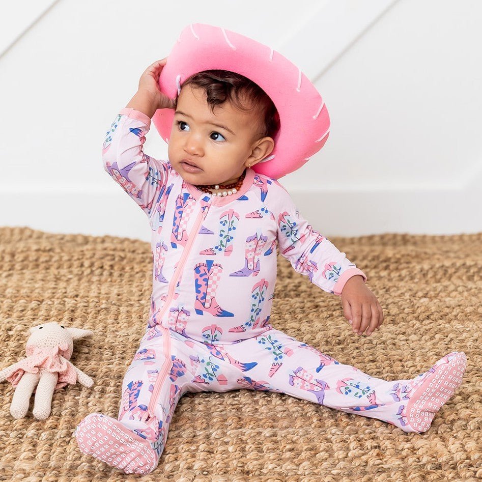 Keep your little one snuggled up in our western cowgirl boot print footie! Made with super soft bamboo, this footie features cowgirl boots all over the print and a dual 2-way zipper for hassle-free diaper changes. Plus, keep little hands warm with fold over mittens on NB and 0/3m sizes, and foot grips on larger sizes. So soft and cozy, your baby will love it!
